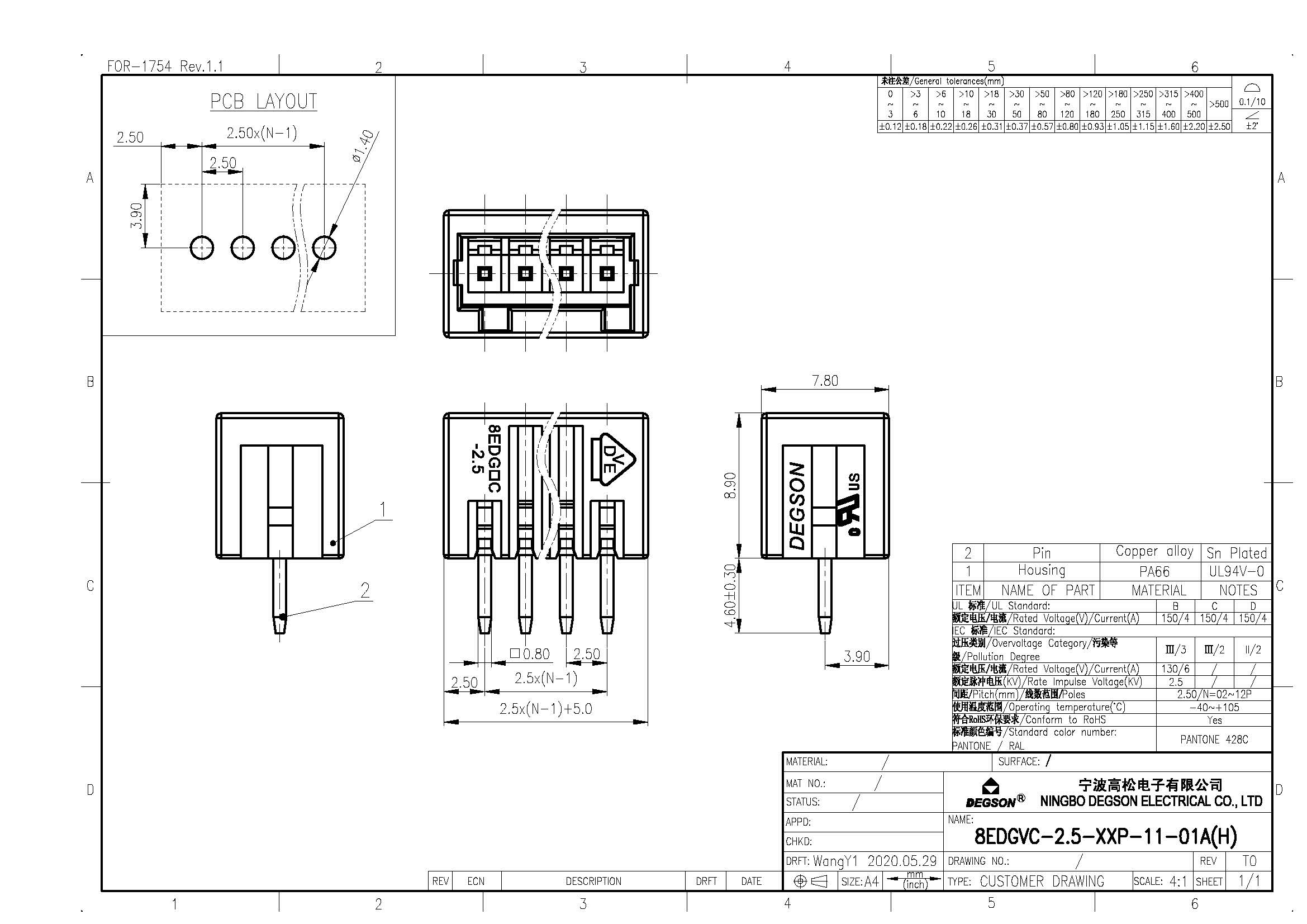 8EDGVC-2.5-06P-11-01Z(H), Клемма на печатную плату, 6...
