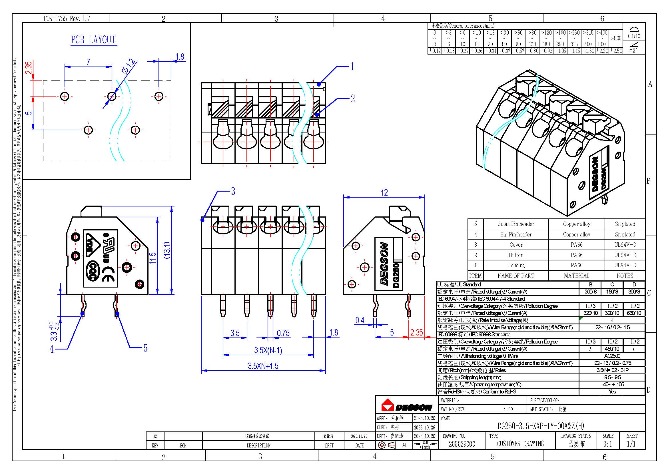 DG250-3.5-16P-11-00Z(H), Клемма на печатную плату, 16...