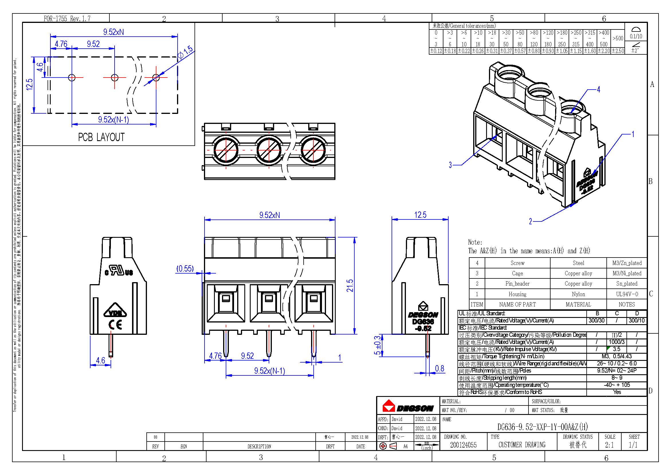 DG636-9.52-03P-14-00Z(H), Клемма на печатную плату, 3...
