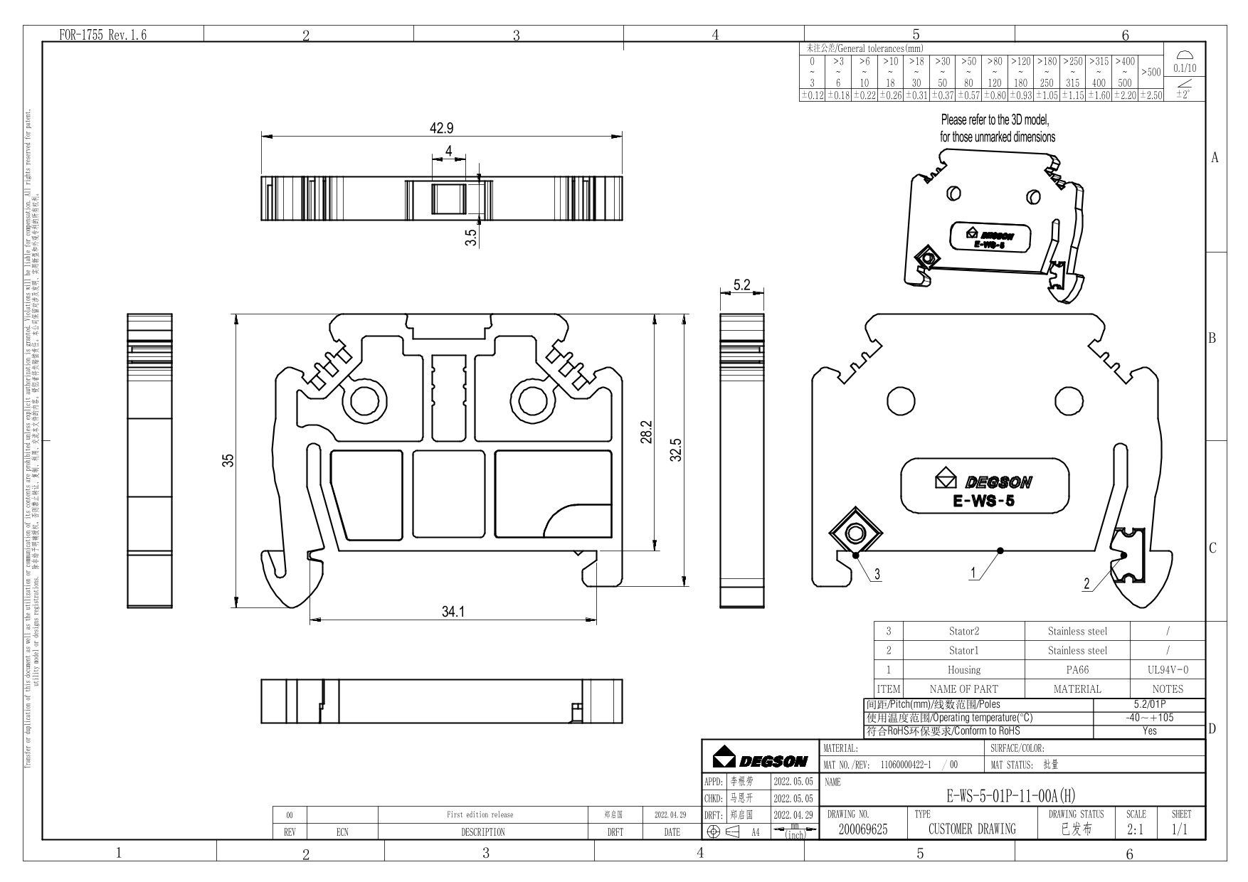 E-WS-5-01P-11-00Z(H), Концевой стопор, рейка 35,...