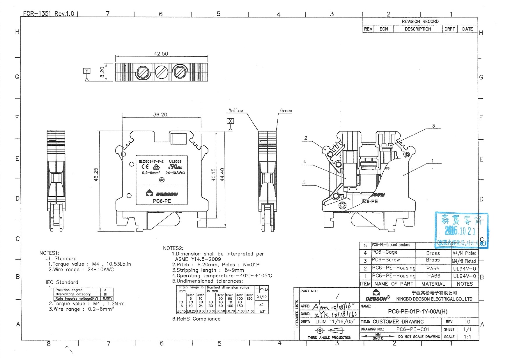 PC6-PE-01P-1Y-00Z(H), Клемма на дин-рейку, 6 кв.мм, 1...